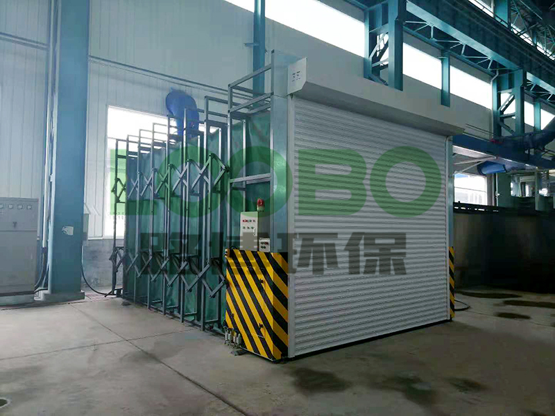 鍛壓廠鍛造壓機(jī)火焰切割機(jī)橫梁伸縮有效行程5m,升降有效行程3m,其長*寬*高=6.8*6*4.1m,本方案設(shè)計(jì)使用可滑動房進(jìn)行煙塵收集,房體長4米,寬4.5米,高4米,可滑動距離10米,配獨(dú)立驅(qū)動系統(tǒng),隨切割機(jī)一起動作。系統(tǒng)設(shè)計(jì)風(fēng)量22000m3/h,采用一臺高效濾筒除塵器,