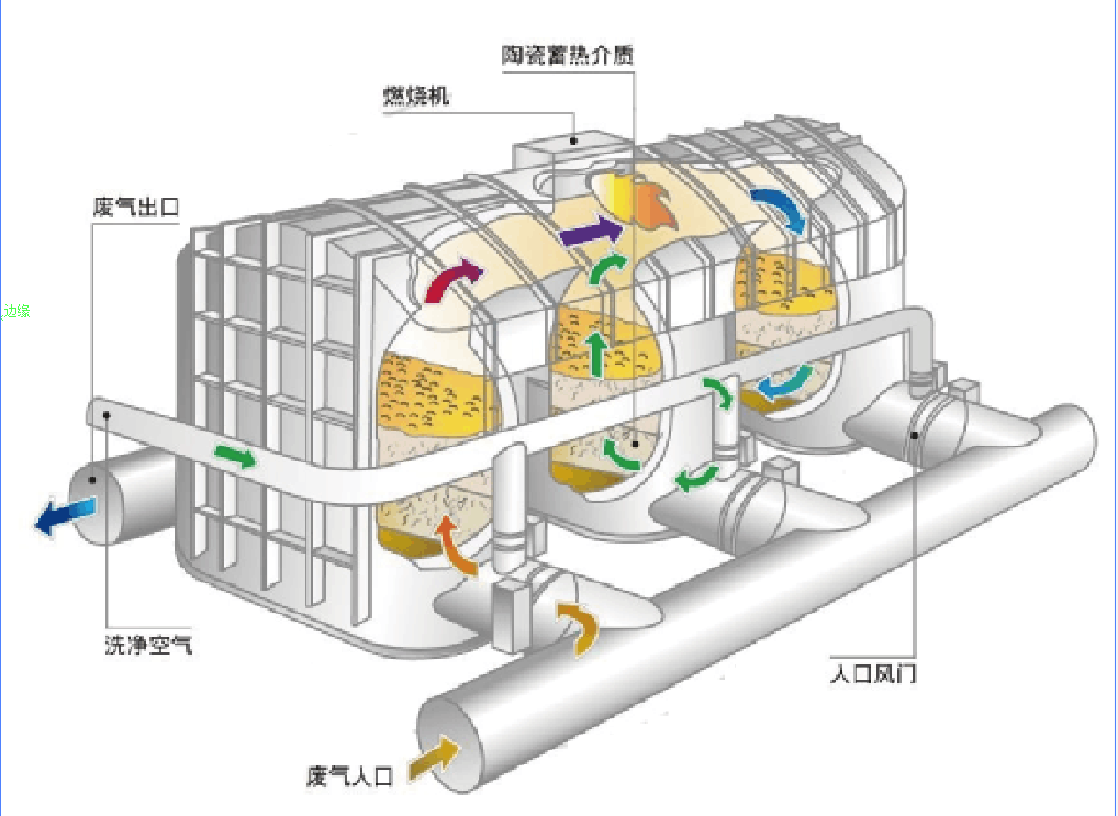 底盤整體噴漆線廢氣濃縮焚燒系統(tǒng)RTO的核心是氧化室和蓄熱室,分別提供氧化反應所需要的反應時間和溫度條件,RTO設備主要由上室體、下室體、風閥、加熱系統(tǒng)、風機、超溫泄放裝置等組成。利用陶瓷熱交換填料的熱特性快速吸收熱氣(燃燒處理后的凈化氣)的熱量,用于冷氣的升溫,填料交替性地分別與熱氣或冷氣相互接觸,降低燃料的消耗量,節(jié)約能源。RTO設備共有3個蓄熱室,在下室體通過切換閥的動作,使上室體3個蓄熱室輪流處于進氣放熱、吹掃凈化、排氣蓄熱狀態(tài),循環(huán)往復,連續(xù)工作。