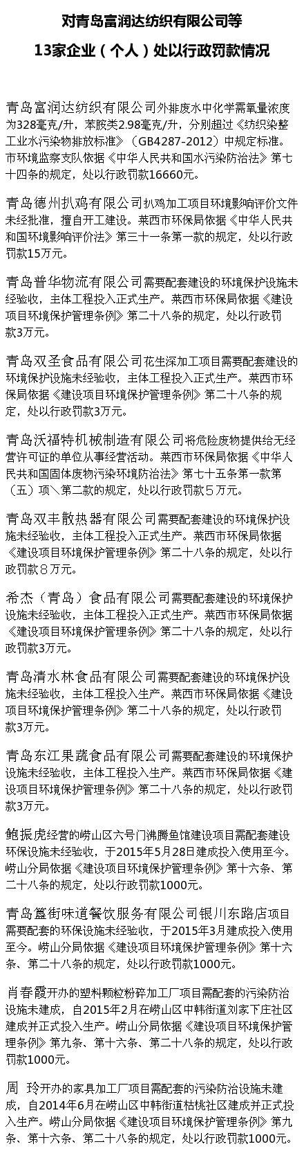 ??????? 9月11日下午,青島市環(huán)保局官方微博公布了對(duì)13家違規(guī)生產(chǎn)企業(yè)(個(gè)人)的處以行政罰款情況,這13家企業(yè)分別是青島富潤(rùn)達(dá)紡織有限公司、青島德州扒雞有限公司、青島普華物流有限公司、青島雙圣食品有限公司、青島沃福特機(jī)械制造有限公司 青島雙豐散熱器有限公司、希杰(青島)食品有限公司、青島清水林食品有限公司、青島東江果蔬食品有限公司、鮑振虎經(jīng)營(yíng)的嶗山區(qū)六號(hào)門沸騰魚館、青島簋街味道餐飲服務(wù)有限公司銀川東路店 肖春霞開(kāi)辦的塑料顆粒粉碎加工廠 周玲開(kāi)辦的家具加工廠。